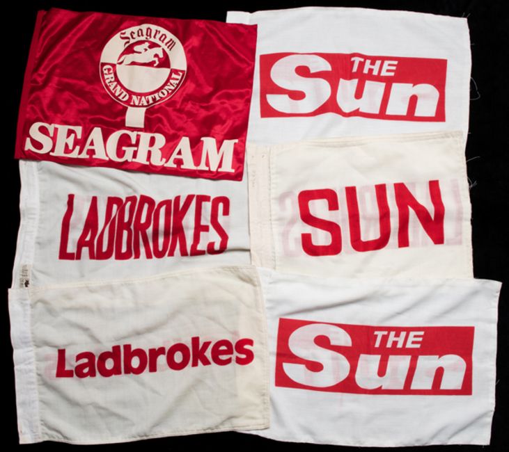 A group of six Grand National Course fence flags from the race sponsorship era,comprising: i & ii) white Ladbroke's bookmakers flags with red text, on inscribed in the hand of Ossie Dale 1979iii to v) white Sun Newspaper flags with red text from the 1983 Grand Nationalvi) a red Seagram flag with white textvarious sizesThe first commercial sponsor of the race was Ladbroke's in 1976. The Sun newspaper sponsored the Grand National in 1983. Seagram sponsored the race between 1984 and 1991.Provenance:The Collection of the late Ossie Dale.