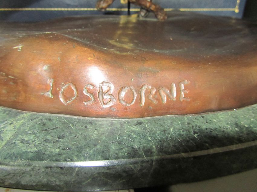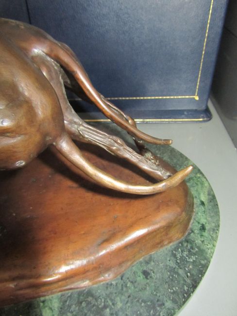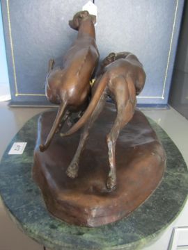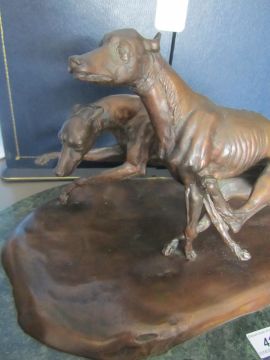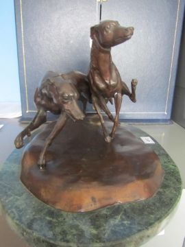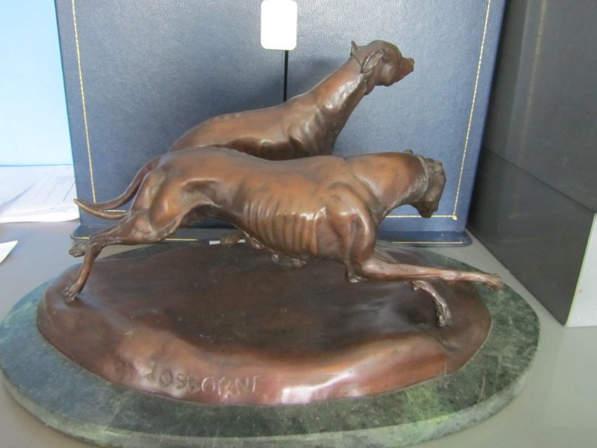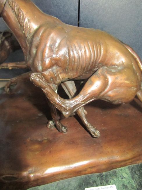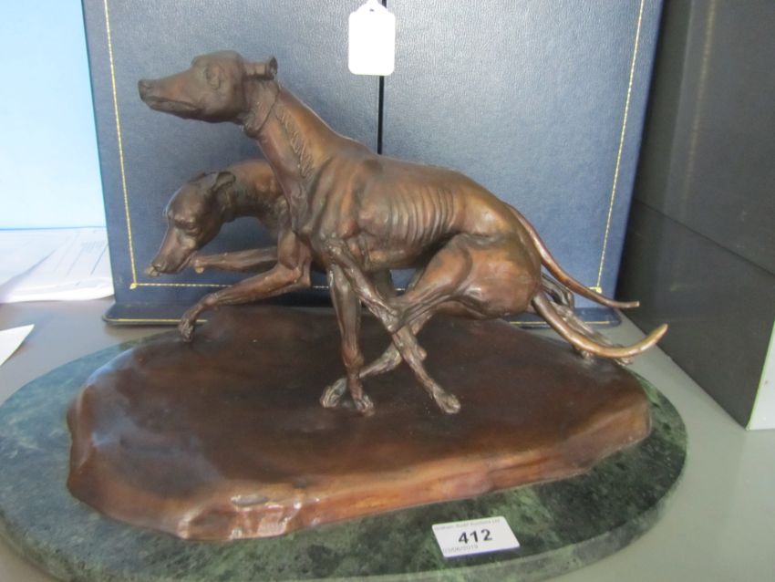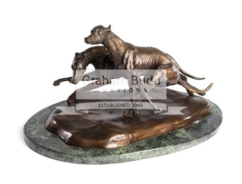 A bronze of two coursing greyhounds by James Osborne (British, 1940-1992), signed, rich brown patina, measuring approx 22 by 37cm by 19cm tall, mounted on a green marble base