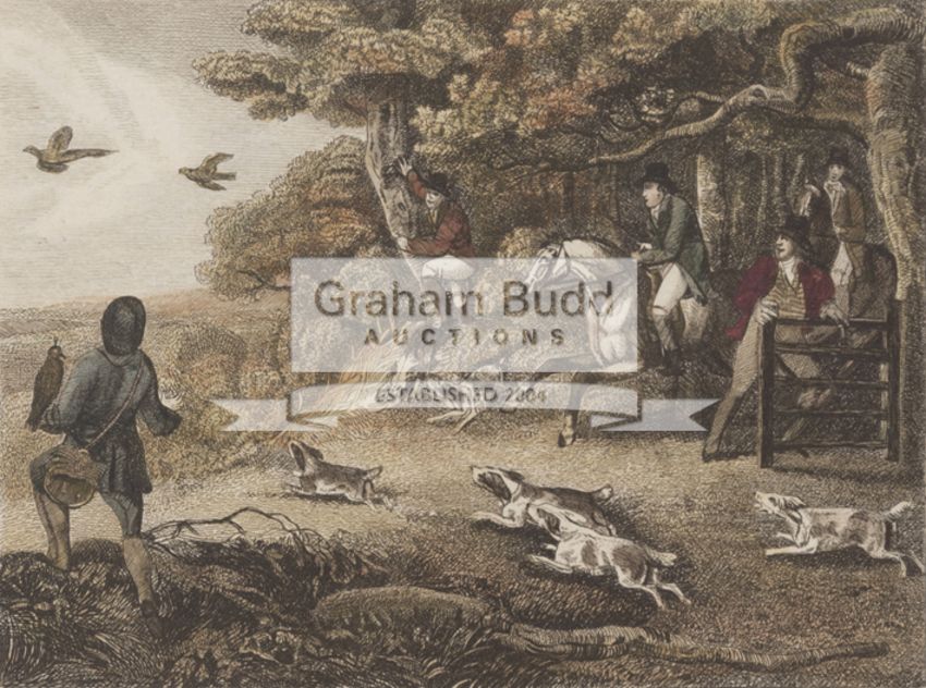 After Samuel Howitt (1765-1822)A GROUP OF 11 COUNTRY PURSUITS PRINTS: DUCK HAWKING, PHEASANT SHOOTING, OTTER HUNTING (two, plates 1 & 2), MINNOW FISHING, DUCK SHOOTNG, PARTRIDGE SHOOTING, SNIPE SHOOTING, PHEASANT HAWKING, PARTRIDGE HAWKING & GROUSE SHOOTING, coloured engravings, each image 13 by 17cm., in black & gilt Hogarth frames, each 25 by 30cm.