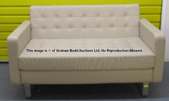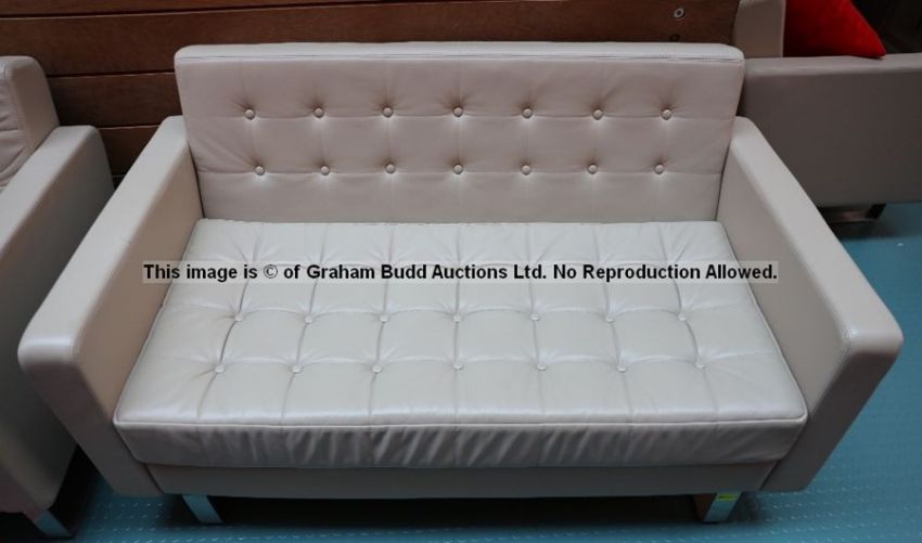 Two-seater cream leather sofa from outside Jurgen Klopp's Manager's Office at Liverpool Football Club's Melwood Training Ground, by Naughtone of Knaresborough, from the Clyde Club range, quilted and button-studded upholstery, double arms, scooped profile, brushed stainless steel sled base, height 76, length 136, depth 79cm., this is one of several sofas being offered in the auction, each show signs of wear to some degree or other, as is to be expected from their period of use at Melwood’s busy working environment; sold with a certificate of authenticity issued by Liverpool Football Club   Please note the photograph with the yellow background is for illustrative purposes only and is not necessarily the actual sofa being sold as this lot, but is of identical design to several being offered in this auction.