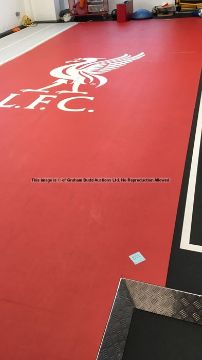 Very large red LFC-crested rubber/foam mat from the Gymnasium Upper Level at Liverpool Football Club's Melwood Training Ground,rectangular, red upper surface with central white LFC Liver bird crest, dark foam reverse, approx. 960 by 360cm., in two parts, rolled, minor wear throughout especially to edges where it was removed from gym floor area; sold with a certificate of authenticity issued by Liverpool Football Club