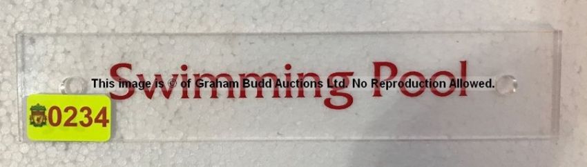 Clear acrylic SWIMMING POOL door sign from the Medical Corridor at Liverpool Football Club's Melwood Training Ground, rectangular, red lettering and two drill holes, 5 by 25cm.; sold with a certificate of authenticity issued by Liverpool Football Club