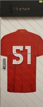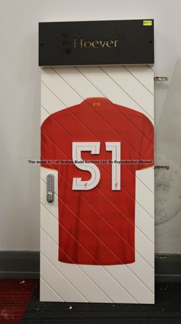 Ki-Jana Hoever's No.51 locker door from the First Team Changing Room at Liverpool Football Club's Melwood Training Ground, rectangular hinged door attached with HOEVER black acrylic cut-out name plate panel covering door light, set above white-panelled section painted with back-view of red short-sleeved jersey, collar marked 96 between two yellow flames, 51 in white figures with LFC crest on each, push-button locking system, reverse bearing some locker hinges, 129 by 53 by 7cm., wear throughout, lighting & locking systems not tested; sold with a certificate of authenticity issued by Liverpool Football Club