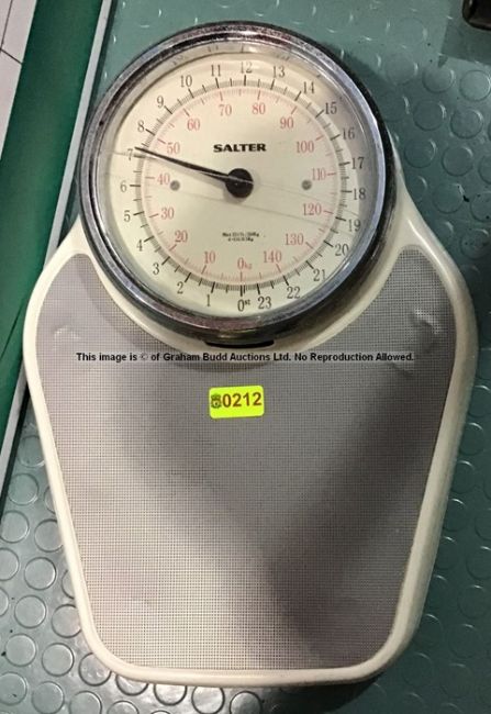 Salter weighing scales from Changing Room 'A' at Liverpool Football Club's Melwood Training Ground,white, rubberised footplate, dial figures in metric and imperial, 46 by 31 by 5cm., inoperative, crack across dial; sold with a certificate of authenticity issued by Liverpool Football Club