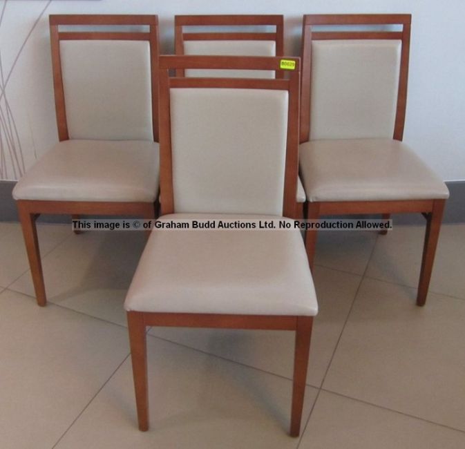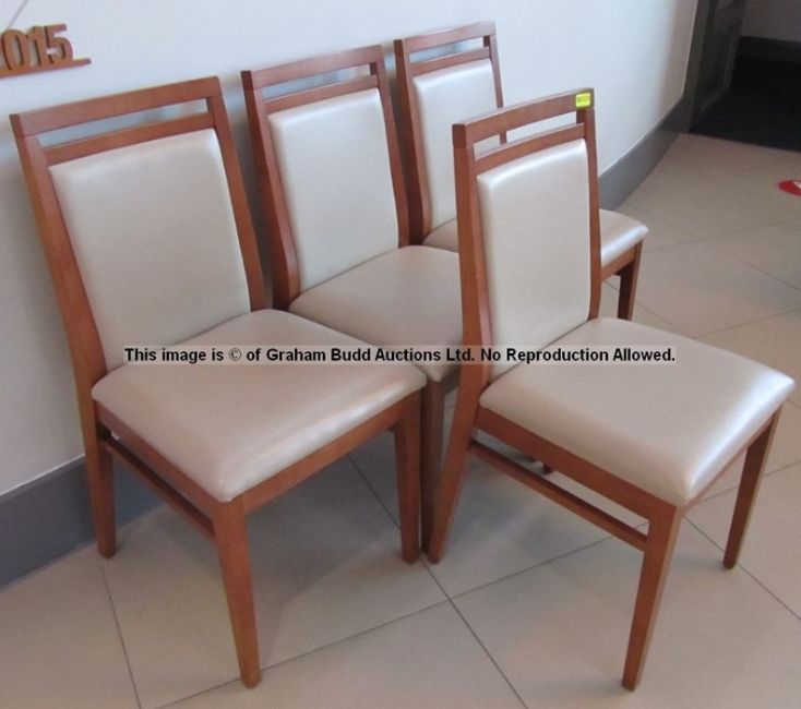 Four matching wooden dining chairs from the Players' and Staff Canteen at Liverpool Football Club's Melwood Training Ground,cream leather-look upholstered seats and backrests, branded 'Protocol', each approx. 91 by 46 by 46cm.,good, some minor surface scratches or dents to frames (4); sold with a certificate of authenticity issued by Liverpool Football ClubSix dining tables used in the Players' and Staff Canteen at Melwood are being offered elsewhere in the auction as lots 378 and 380 to 384 inclusive.