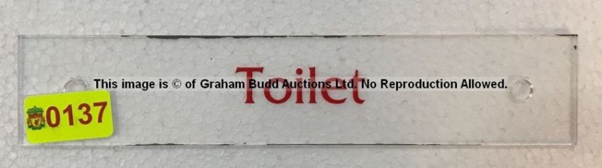Clear acrylic TOILET door sign from Scouting Corridor at Liverpool Football Club's Melwood Training Ground,rectangular, red lettering and two drill holes, 5 by 25cm.; sold with a certificate of authenticity issued by Liverpool Football Club