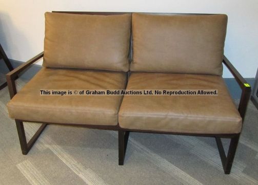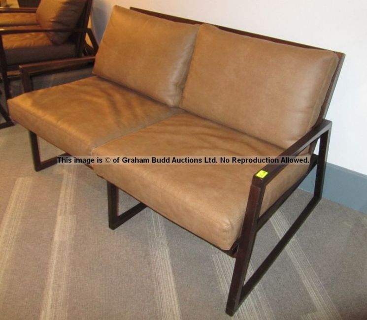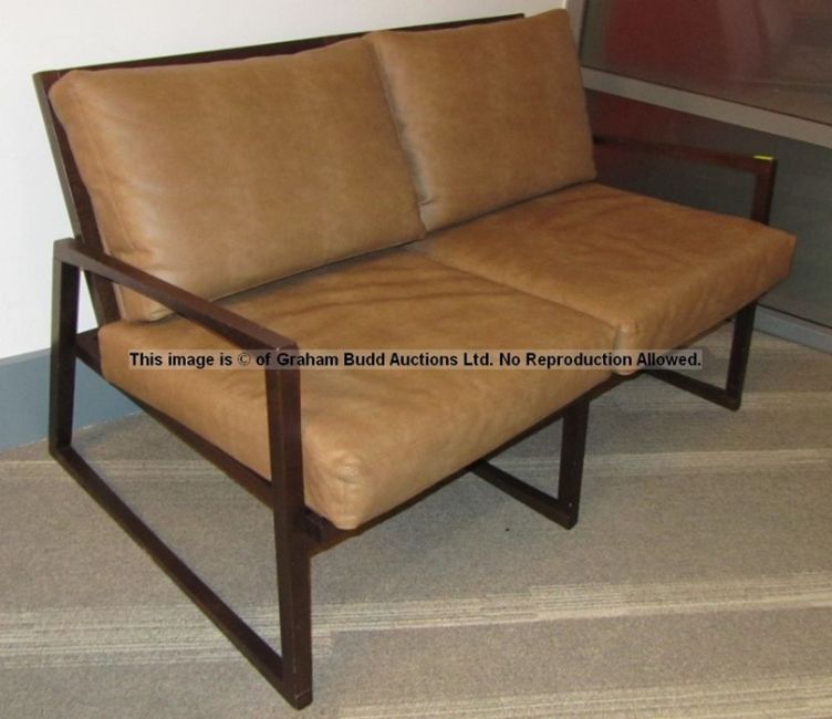 Tan faux leather two-seater sofa from the First Team Changing Room at Liverpool Football Club's Melwood Training Ground, rectangular form, brown stained wood frame, with cushioned seating and backrest, approx. 78 by 140 by 85cm., minor wear to frame and cushions; sold with a certificate of authenticity issued by Liverpool Football Club