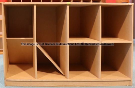 Coaching Staff's floor-standing wooden shelving unit from the Laundry Room at Liverpool Football Club's Melwood Training Ground, sturdy wood composite open-fronted storage unit comprising eight divided sections each 37 by 35 by 48cm., some with attached black marker pen-written name labels, unit overall 86 by 150 by 53cm., wear throughout, dent to top; sold with a certificate of authenticity issued by Liverpool Football Club