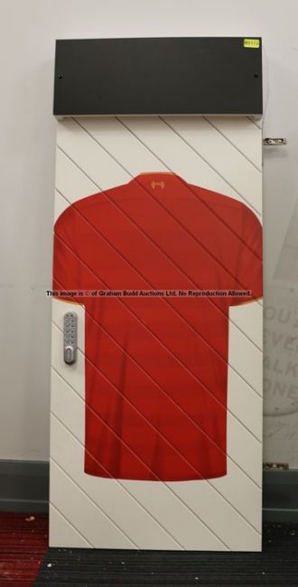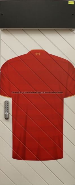 Locker door from the First Team Changing Room at Liverpool Football Club's Melwood Training Ground, rectangular hinged door attached with blank black acrylic uncut name plate panel covering door light, set above white panelled section painted with back-view of red short-sleeved jersey, collar marked 96 between two yellow flames, blank where player's number would normally be attached to jersey, push button locking system, reverse bears some locker hinges, 129 by 53 by 7cm, bears wear throughout, lighting & locking systems not tested, no cut-out name plate or player's number included in this lot; sold with a certificate of authenticity issued by Liverpool Football Club