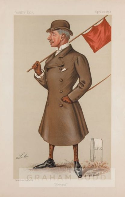Twelve Vanity Fair equestrian prints, circa 1900seach with titles such as including ‘Starting’, ‘Cattistock’, ‘Mr Hargreaves’, ‘Mr Alfred Gwynne Vanderbilt’ and others, approx.39 by 26cm., minor wear to page edges, (12)