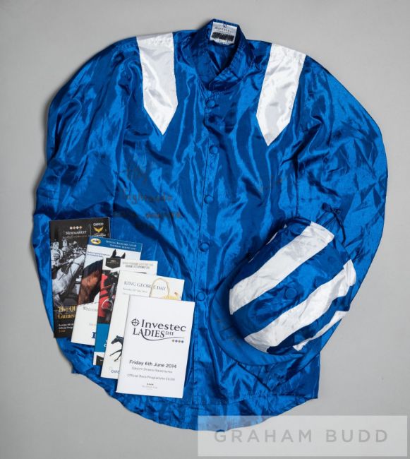 royal blue, white epaulets and striped cap, signed by Paul Hanagan and the filly’s trainer John Gosden in gold marker pen, sold with days racecard and Queen's Stand badge and four further race cards in which Taghrooda featured, including the King George Day 26th July 2014