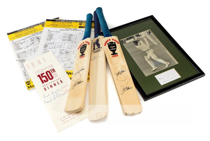 comprising a trio of mini-bats, two double-signed by Dennis Lillee and Jeff Thomson, the other signed by Brian Lara; a framed photo with signature of Gary Sobers; and paper ephemera, programmes, scorecards, menus etc., some bearing autographs including Mike Proctor and Basil D'Oliveira, and autographs from the 1993 Ashes series v Australia and the 1995 Test series v West Indies (qty.)