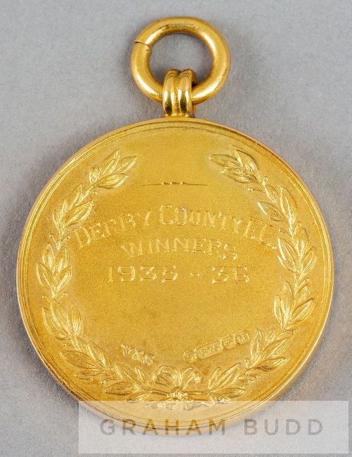 Central League winner's medal awarded to a Derby County player in season 1935-36,9ct. gold, Birmingham, 1936, by Vaughton & Sons Ltd., obverse with central blue enamelled crest surrounded by THE CENTRAL LEAGUE, reverse engraved with DERBY COUNTY WINNERS 1935-36 surrounded by a laurel leaf wreath, of circular form with suspension ring, diameter 28mm., weight 18gr., with original fitted case, the lid with gilt tooling THE CENTRAL LEAGUE, the interior with makers label in giltThe original recipient of this medal is unknown. The Central League was formed in 1911 and originally had a mixture of Football League club reserve teams and other clubs' first teams. When the Football League formed a Third Division North in 1921, all the first teams playing in the Central League were elected to that and since then The Central League has consisted solely of reserve teams. This was a first time Derby County won this title, winning again in 1971-72 before the split into two divisions in 1982, where they won again 1985-86.