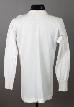 Football League representative jersey worn by Arsenal's Alf Baker in the match v Ireland played at Anfield, Liverpool, 7th October 1925,white, by Merigold Brothers, Preston, long-sleeved with embroidered badge FL IRISH MATCH 1925-26, unnumbered, bears stainingThe Football League defeated Ireland 5-1 with Walker of Aston Villa and Kirkham of Port Vale scoring braces.Born in Ilkeston, Derbyshire, Baker was originally a miner and played for various clubs in Derbyshire as an amateur, including Eastwood Rangers. During World War I he guested for Chesterfield, Crystal Palace and Huddersfield Town, although these appearances are not considered official. In 1919 he turned professional and signed for Arsenal; according to club legend, Arsenal manager Leslie Knighton signed Baker after meeting him at the pit where he worked, thus beating rivals for the player's signature who were waiting at his home. He made his debut for Arsenal against Newcastle United on 13 August 1919 (which was Arsenal's first-ever top flight game at Highbury). Baker played seventeen matches that season, but in 1920-21 he became a first-team regular; he also had trials for England, though it would be another seven years before he won a cap. A Utility player, "Doughy" (as he was nicknamed) played in every position for Arsenal, including as an emergency goalkeeper on several occasions, though usually played as right half. He was made club captain in 1924. In the 1924-25 season, Baker won two Football League representative caps and also played in the Charity Shield, which was a Professionals v. Amateurs match; the Professionals won 3–1. However, when new manager Herbert Chapman arrived at the end of that season, he made Charlie Buchan captain instead of Baker; Baker continued to play for Arsenal for another five years, though. In 1927, Baker played in Arsenal's first ever FA Cup final; however Arsenal suffered an infamous 1–0 loss to Cardiff City after a mistake by Arsenal goalkeeper Dan Lewis. The following season, he was finally capped for England, appearing against Wales on 28 November 1927; England lost 2–1. It was his only international appearance. Baker finally won a major medal when he played in Arsenal's 1930 FA Cup final win over Huddersfield Town; by now he had nearly reached the end of his career. He played only one more game for the club (also against Huddersfield, on 7 March 1931) before retiring from the game aged 33 in the summer of 1931. In all, he played 351 matches for Arsenal, scoring 26 goals.