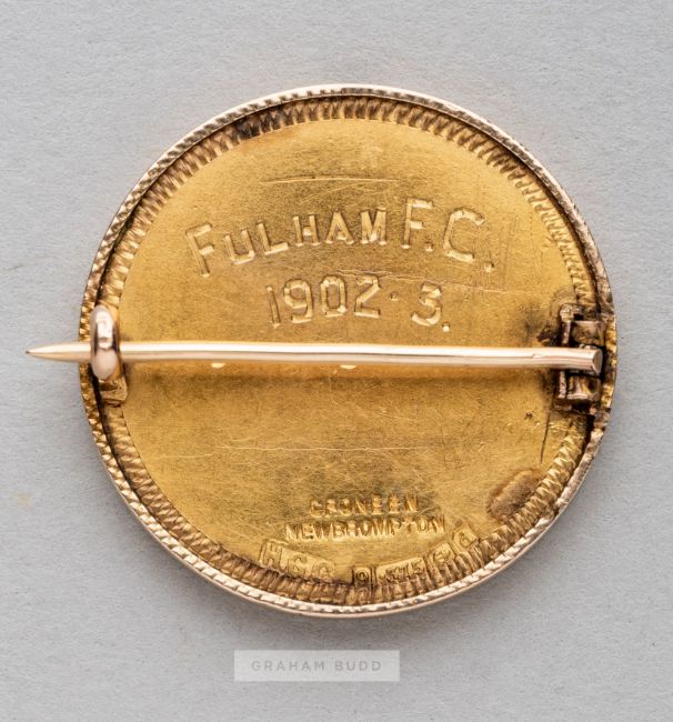 Southern League Division Two Championship medal awarded to Fulham's Jack Head in season 1902-03,9ct. gold, Birmingham, 1903, by Horace George Croneen, obverse inscribed SOUTHERN LEAGUE CHAMPIONSHIP DIVISION TWO, reverse engraved FULHAM F.C. 1902-3, with later applied brooch pin,  circular, diameter 26mm, weight 8gr.Jack Croneen played in each game during the season 1902-03.
