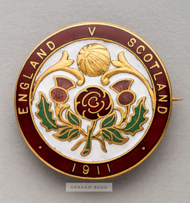 Sir Frederick Wall's Football Association Official's badge for the England v Scotland international played at Goodison Park, Everton, 1st April 1911,obverse inscribed ENGLAND V SCOTLAND 1911 with rose and thistle emblems in red, white and green enamel, brooch pin back, diameter 32mm.This fixture resulted in a 1-1 draw.Lots 1 to 11 Sir Frederick Wall CollectionSir Frederick Joseph Wall (1858-1944) became Secretary of the Football Association in 1895 and held the position until his retirement in 1934, at which point he took a Directorship at Arsenal FC until 1938. He was knighted in the 1930 New Year Honours.