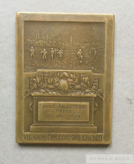 French Football Association medal plaquette for the International friendly v England in Paris, 26th May 1938, bronze, obverse with a maiden holding a sheaf of wheat inscribed FEDERATION FRANCAISE DE FOOTBALL ASSOCIATION INSTITUEE LE 7 AVRIL 1919, reverse with footballers in relief, inscribed FRANCE ANGLETERRE PARIS 26 MAI 1938, VIS ANIMI CVM CORPORE CRESCIT, of rectangular form, 63 by 47mm., 98gr., no case with this lot The original recipient of this medal is unknown.  England defeated France 4-2, with goals for England by Franke Broome, Ted Drake (2) and Cliff Bastin. Provenance: Consigned from the Bryan Horsnell Collection