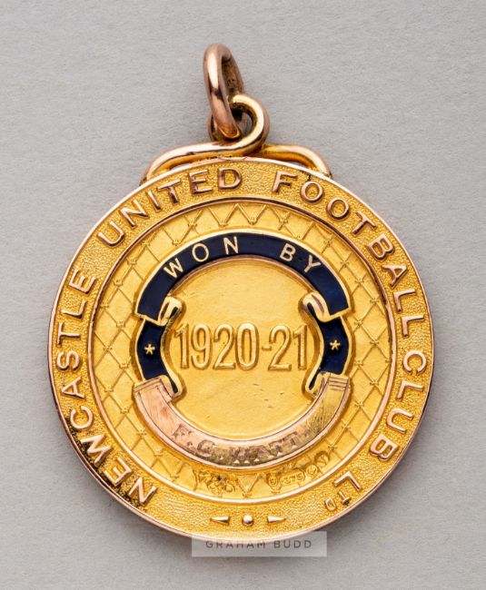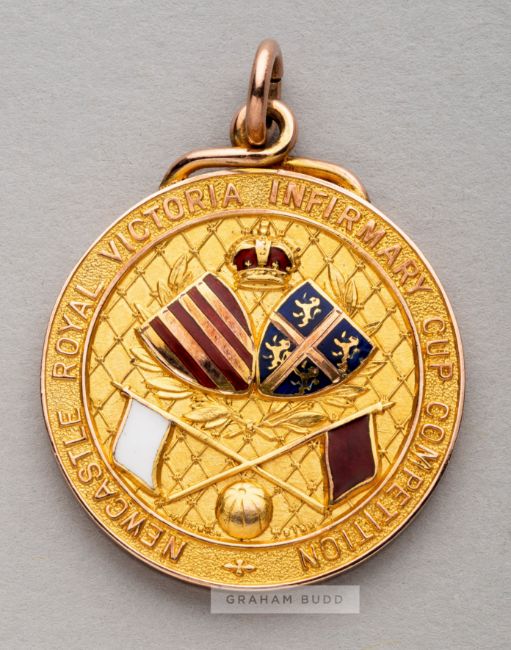 Newcastle Royal Victoria Infirmary Cup Competition winner's medal awarded to Newcastle United's Frank Watt in 1920-21,9ct. gold, Birmingham, 1920, by Vaughton & Sons Ltd. obverse inscribed NEWCASTLE ROYAL VICTORIA INFIRMARY CUP COMPETITION with enamelled flags and shields in red, white and blue, reverse inscribed NEWCASTLE UNITED FOOTBALL CLUB 1920-21 WON BY F.G WATT with blue enamel, circular with suspension ring, diameter 30mm., weight 18gr.Frank Watt Collection (Lots 12 to 19).Frank "The Guv'nor" Watt was the first manager of Newcastle United FC between 1895 and 1930. He also held the post of Club Secretary for a while longer until 1935. Watt's powers were not as full as a modern day manager, in particular team selection which was made by committeee.Frank George Watt (c.1854-1932), a Scotsman, came to Newcastle following a period as Secretary of the East of Scotland Football Association.During his time at Newcastle United, the club won the First Division Championship title four times in 1905, 1907, 1909 and 1927. They won the F.A. Cup 1910 and 1924 and were finalists on four more occasions, in 1905, 1906, 1908 and 1911.