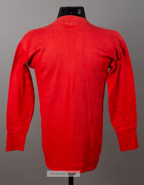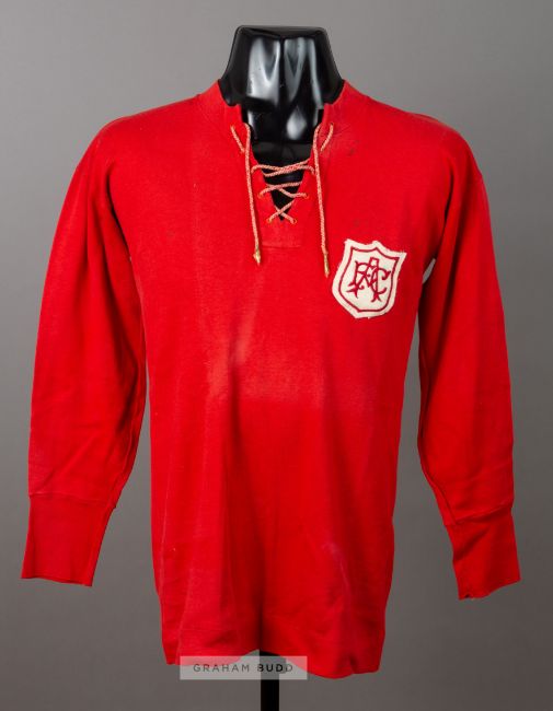 Alf Baker's match-worn red Arsenal jersey from the 1927 F.A. Cup Final v Cardiff City,by Bukta, long-sleeved with embroidered club crest, lace up collarArsenal were defeated by Cardiff City 1-0 at Empire Stadium on 23rd April 1927, this remains the only time when the FA Cup trophy was won by a team based outside of England.Born in Ilkeston, Derbyshire, Baker was originally a miner and played for various clubs in Derbyshire as an amateur, including Eastwood Rangers. During World War I he guested for Chesterfield, Crystal Palace and Huddersfield Town, although these appearances are not considered official. In 1919 he turned professional and signed for Arsenal; according to club legend, Arsenal manager Leslie Knighton signed Baker after meeting him at the pit where he worked, thus beating rivals for the player's signature who were waiting at his home. He made his debut for Arsenal against Newcastle United on 13 August 1919 (which was Arsenal's first-ever top flight game at Highbury). Baker played seventeen matches that season, but in 1920-21 he became a first-team regular; he also had trials for England, though it would be another seven years before he won a cap. A Utility player, "Doughy" (as he was nicknamed) played in every position for Arsenal, including as an emergency goalkeeper on several occasions, though usually played as right half. He was made club captain in 1924. In the 1924-25 season, Baker won two Football League representative caps and also played in the Charity Shield, which was a Professionals v. Amateurs match; the Professionals won 3–1. However, when new manager Herbert Chapman arrived at the end of that season, he made Charlie Buchan captain instead of Baker; Baker continued to play for Arsenal for another five years, though. In 1927, Baker played in Arsenal's first ever FA Cup final; however Arsenal suffered an infamous 1–0 loss to Cardiff City after a mistake by Arsenal goalkeeper Dan Lewis. The following season, he was finally capped for England, appearing against Wales on 28 November 1927; England lost 2–1. It was his only international appearance. Baker finally won a major medal when he played in Arsenal's 1930 FA Cup final win over Huddersfield Town; by now he had nearly reached the end of his career. He played only one more game for the club (also against Huddersfield, on 7 March 1931) before retiring from the game aged 33 in the summer of 1931. In all, he played 351 matches for Arsenal, scoring 26 goals.