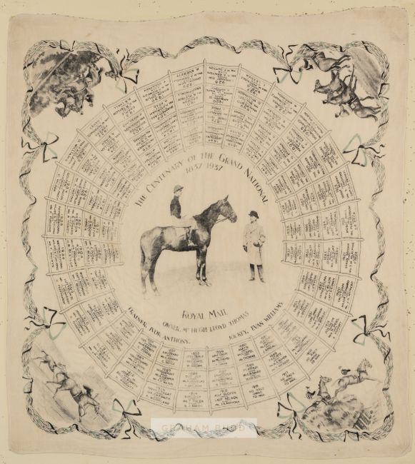 The Centenary of the Grand National 1837-1937 scarf, featuring racehorse Royal Mail with owner Hugh Lloyd Thomas, the scarf listing the names of each winning racehorse with owners and riders, the four corners of the scarf different views of the racecourse, mounted, glazed and framed, overall 63 by 59cm., scarf bears some wear and fadingProvenance:The Stan Mellor CollectionPlease be aware all glass will be removed from framed and glazed items prior to posting and may result in delays to shipping your items. (This service is included in the cost of postage and packing). We can also totally remove all framing and mounts upon request to reduce shipping costs. Alternatively lots can be collected in person by prior appointment from NN8 1RT.