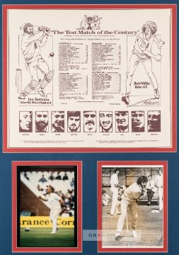 "The Test Match of the Centenary" England v Australia third test match at Headingley, Leeds, 16th - 21st July 1981 display. Comprising souvenir handkerchief printed with caricatures of Ian Botham and Bob Willis flanking the scoresheet above player portraits, mounted above two signed individual colour photographs of both cricketers, each signed in pen, both signatures faded slightly.  Glazed and framed, overall size 91 by 69cm. Please be aware all glass will be removed from framed and glazed items prior to posting and may result in delays to shipping your items. (This service is included in the cost of postage and packing). We can also totally remove all framing and mounts upon request to reduce shipping costs. Alternatively lots can be collected in person by prior appointment from NN8 1RT.