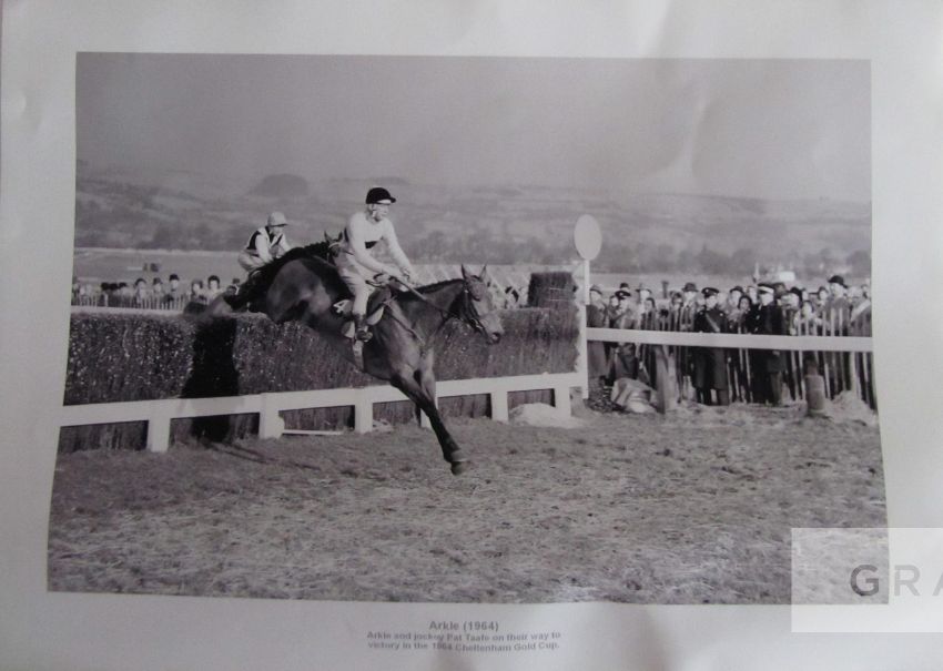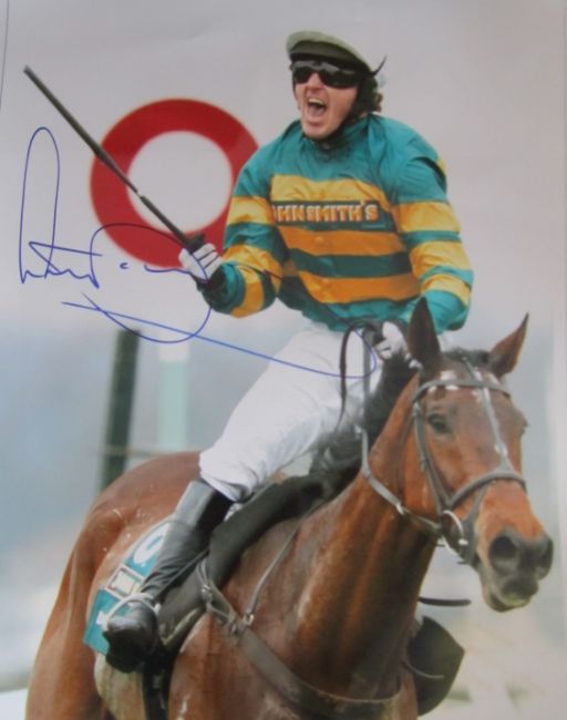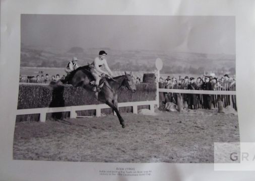 Signed horse racing memorabilia,comprising: i) a photographic print of the jockey A.P. McCoy, signed in blue marker pen, McCoy depicted at the winning post on “Don’t Push It” in the 2010 Grand National, 40 by 30cm., tube rolled, with a COA; ii) a b&w photo print of Arkle and Pat Taaffe on their way to victory in the 1964 Cheltenham Gold Cup, 30 by 42cm., creases.; and a framed limited edition Susan Crawford print featuring a portrait of Lester Piggott, 24/1,500, signed in pencil to the lower margin by the artist and jockey, 46 by 40cm. (3)Please be aware all glass will be removed from framed and glazed items prior to posting and may result in delays to shipping your items. (This service is included in the cost of postage and packing). We can also totally remove all framing and mounts upon request to reduce shipping costs. Alternatively lots can be collected in person by prior appointment from NN8 1RT.
