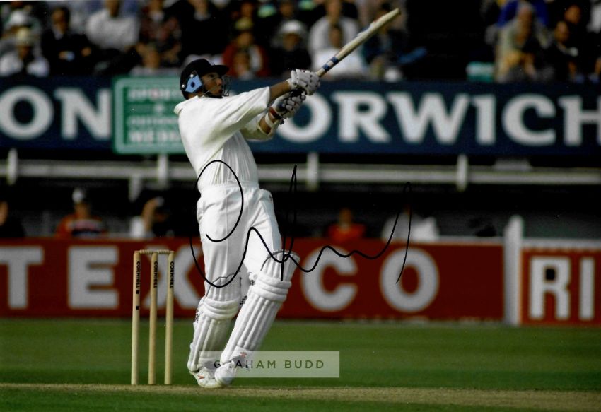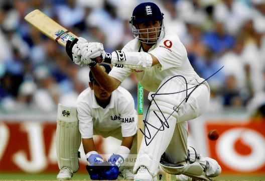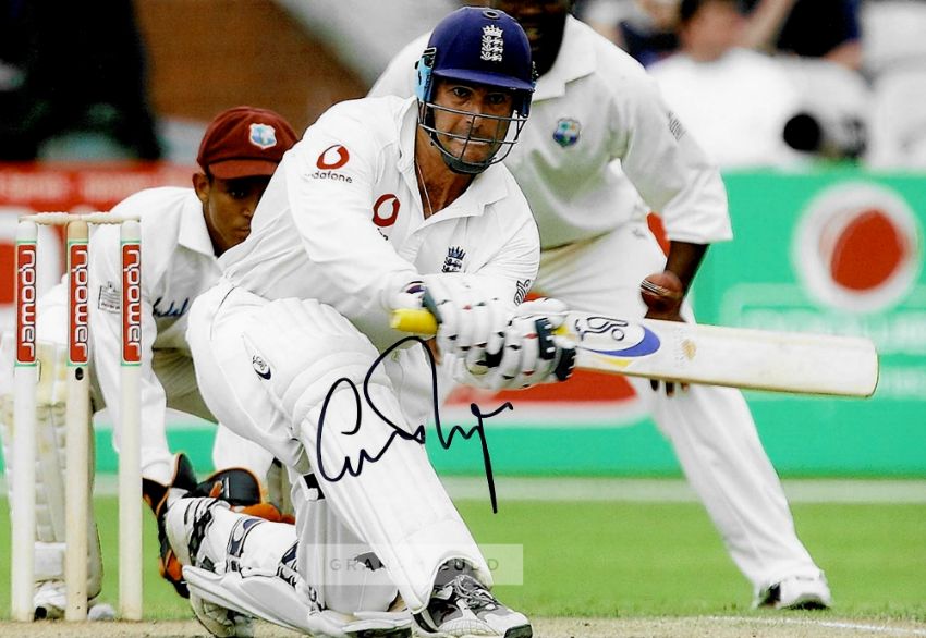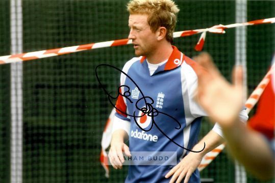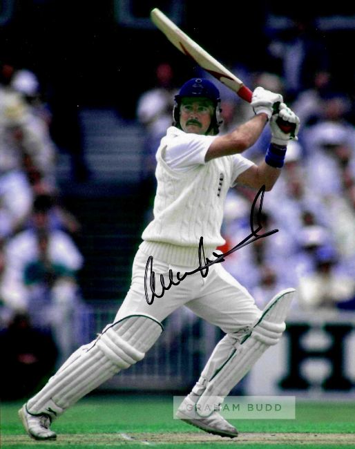 Collection of signed photographs of former England Cricket legends,comprising Alec Stewart OBE; Mike Brearley OBE; Michael Atherton OBE; Paul Collingwood MBE, OBE; Phil Tufnell; Graham Thorpe MBE; Michael Vaughan OBE; Nasser Hussain OBE; all 8 by 12in. and Allan Lamb; David Gower, both 8 by 10in., with COA and photograph of signings, (10)