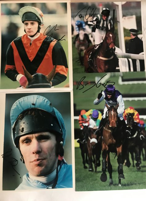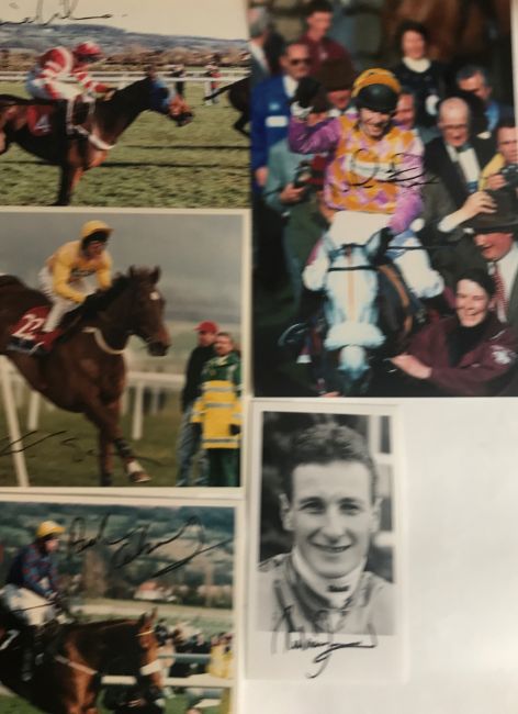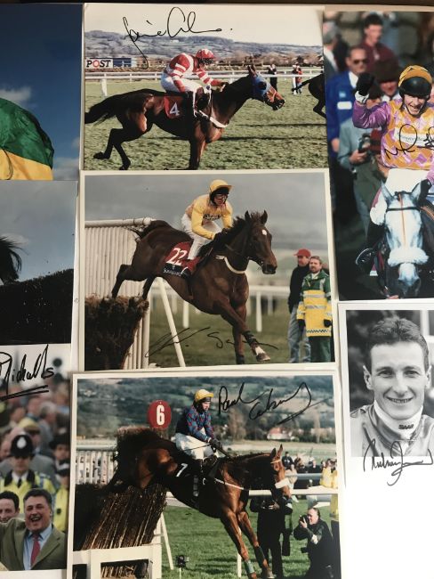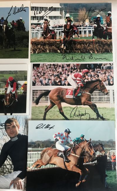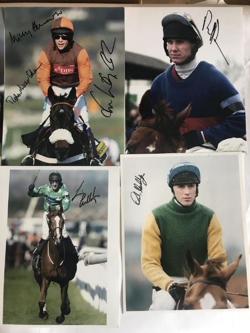 signed in black marker pen, majority 12 by 8in., including Tommy Stack, Ginger McCain (Red Rum), R Waley-Cohen, S Waley-Cohen, Henderson (Long Run), Culloty (2), Lewis, Knight, Biddlecombe (Best Mate), JP McManus, O'Brien, Swan (Istabraq), Dobbin, Walsh (2), Nicholls and Walsh (Azertyuiop), Geraghty, Thomas Walsh, McCoy (3), Dunwoody (2), Fitzgerald, Osborne, P Scudamore, Swan, O'Neill, M Pipe (2), Oaksey, Johnson (2), Llewellyn (2), Barton (2), Farrant, P Carberry, Maguire, Maude, Jenks, (qty)