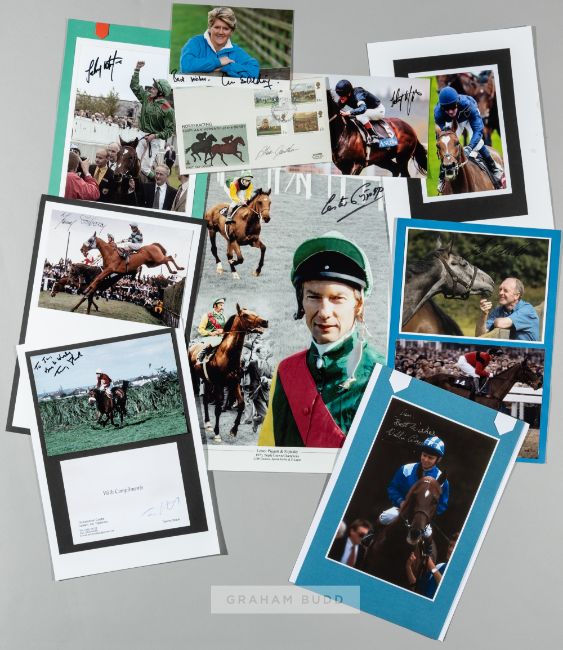 Collection of horse racing autographs, including Frankie Dettori and Richard Hughes signed autobiographies, Nijinsky signed by Lester Piggott, and numerous signed pictures and photographs of leading jockeys and trainers including AP McCoy, Willie Carson, John Jo O'Neill, Ryan Moore, Sir Michael Stoute, Richard Dunwoody, Paul Nicholls, John Gosden, William Buick, Nicky Henderson, Johnny Murtagh, Luca Cumani, David Elsworth, Steve Cauthen, Mick Kinnane, Mark Johnston, and many others, (qty)