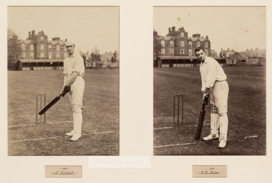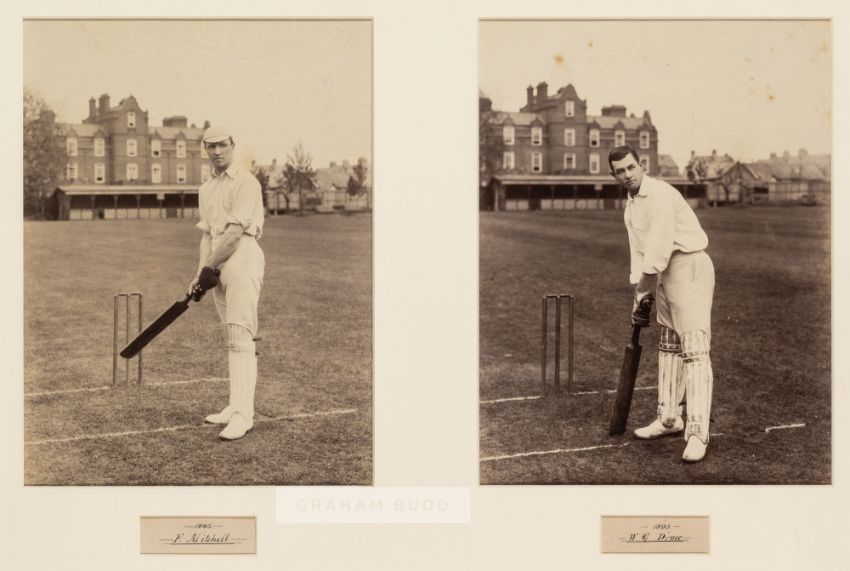 Two b&w photographs of Cambridge University cricketers Frank Mitchell and Walter Druce, circa 1890s,each holding a cricket bat at the wicket in front of the pavilion, both mounted above hand written titles in black ink, glazed and framed, overall 44 by 63cm.Frank Mitchell captained South Africa at cricket as well as representing England at rugby and played in some Cambridge University XI. Walter George Druce played for Cambridge University, MCC and other other teams as a gentleman player.
