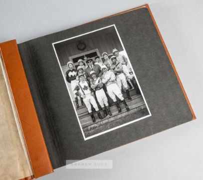 the album cover inscribed in gilt and bearing the logo of the Racegoers Club, the album containing eight b & w photographs, including jockey groups, race action, trophy presentation and other subjects; sold together with a Colonial Cup (Camden, South Carolina) souvenir pint tankard in American pewter by Wilton, Columbia, PA (2)