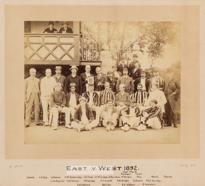 Photograph of the cricket teams in the East v West match in 1892, The b&w photograph of the cricket teams in standing and seated pose in front of the Tonbridge club house, impressed stamp for WEST & SONS SOUTHSEA, laid on card with legend below, mounted, glazed and framed, overall size 54 by 57cm.   Please be aware all glass will be removed from framed and glazed items prior to posting and may result in delays to shipping your items. (This service is included in the cost of postage and packing). We can also totally remove all framing and mounts upon request to reduce shipping costs. Alternatively lots can be collected in person by prior appointment from NN8 1RT.