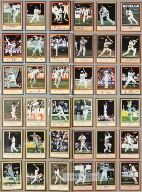 Collection of signed cricket player profile autograph collectors cards,contained in plastic sleeves in a ring binder folder, each individual card of the player with printed details of club etc., signed in ink by the individual player, to include Barnett Derbyshire, I.T. Botham Durham, P.M. Such Essex, C.P. Metson Glamorgan, and many more, approximately 216 cards, (1 folder)