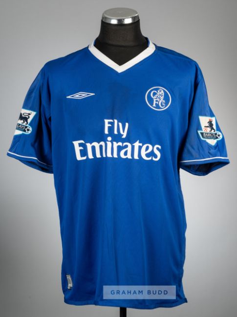 Damian Duff signed blue Chelsea no.11 home jersey, season 2003-04,Umbro, short-sleeved with BARCLAYS PREMIERSHIP sleeve badges, club crest and sponsor logo, reverse lettered DUFF, signed in black marker pen on reverse on first number one, size L