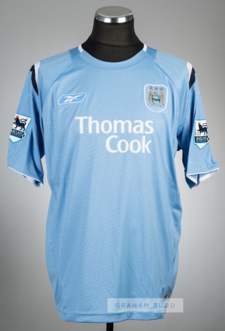 Kiki Musampa blue Manchester City no.14 home jersey, season 2005-06,Reebok, short-sleeved with BARCLAYS PREMIERSHIP sleeve badges, club crest and sponsor logo, reverse lettered MUSAMPA, size XL