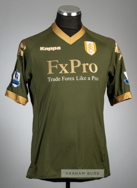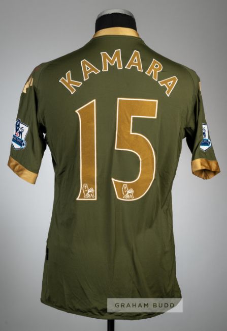 Diomansy Kamara green with gold trim Fulham no.15 third choice jersey, season 2010-11,Kappa, short-sleeved with BARCLAYS PREMIER LEAGUE sleeve badges, club crest and sponsor logo, reverse lettered KAMARA, no size label, bears inner side seam label