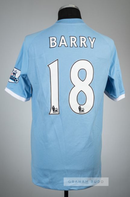 Gareth Barry blue Manchester City no.18 home jersey, season 2010-11,Umbro, short-sleeved with BARCLAYS PREMIER LEAGUE sleeve badges, club crest and sponsor logo, reverse lettered BARRY, size 42in.