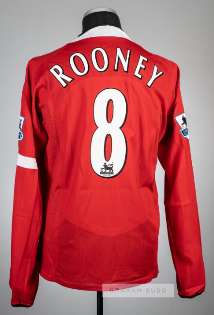 Wayne Rooney red Manchester United no.8 home jersey, season 2004-05,Nike, long-sleeved with BARCLAYS PREMIER LEAGUE sleeve badges, club crest and sponsor logo, reverse lettered ROONEY, size L