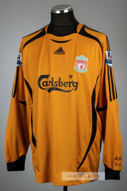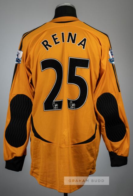 Pepe Reina gold Liverpool no.25 goalkeeper's jersey, season 2006-07,Adidas, long-sleeved with BARCLAYS PREMIER LEAGUE sleeve badges, club crest and sponsor logo, padded elbows, reverse lettered REINA, size XL