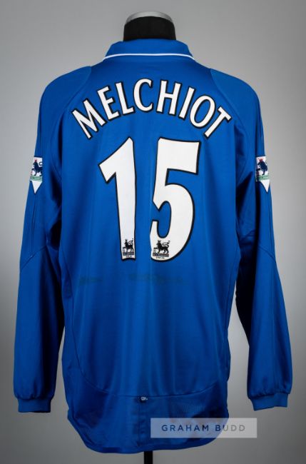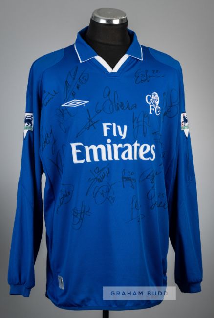 Mario Melchiot squad signed blue Chelsea no.15 jersey, season 2002-03,Umbro, long-sleeved with THE FA PREMIER LEAGUE sleeve badges, club crest and sponsor logo, reverse lettered MELCHIOT, signed to the front in black marker pen by 20 squad members, including Melchiot, Stanic, de Lucas, Guojohnsen, Le Saux, Desailly, Cole, Cudicini, Ferrer and others, sleeves bear sticky marks having been framed at one stageAll glass will be removed from framed and glazed items prior to posting and may result in delays to shipping your items. (This service is included in the cost of postage and packing). We can also totally remove all framing and mounts upon request to reduce shipping costs. Alternatively lots can be collected in person by prior appointment from NN8 1RT.