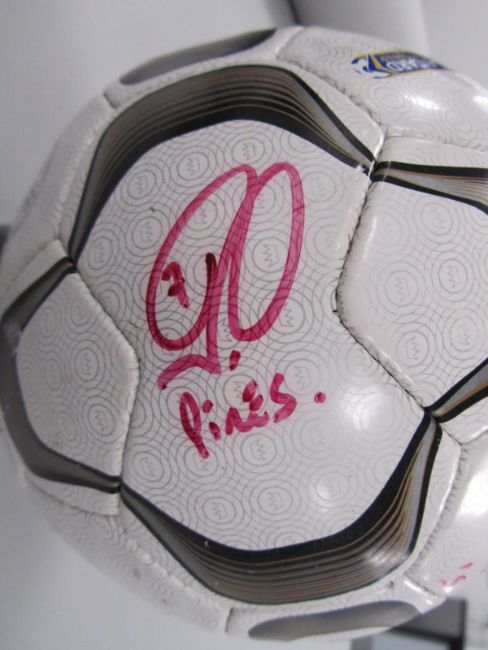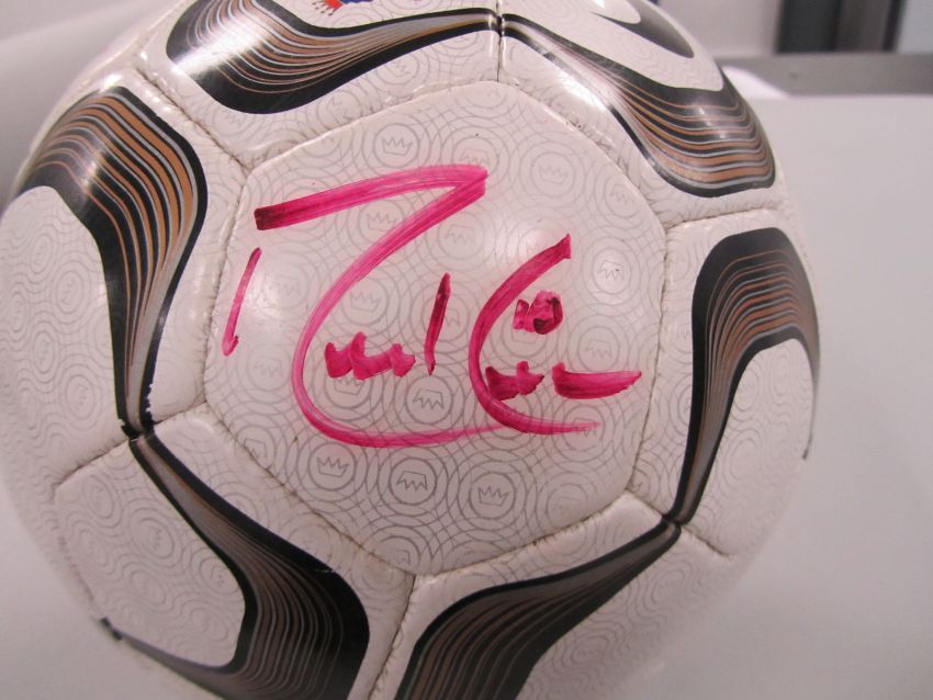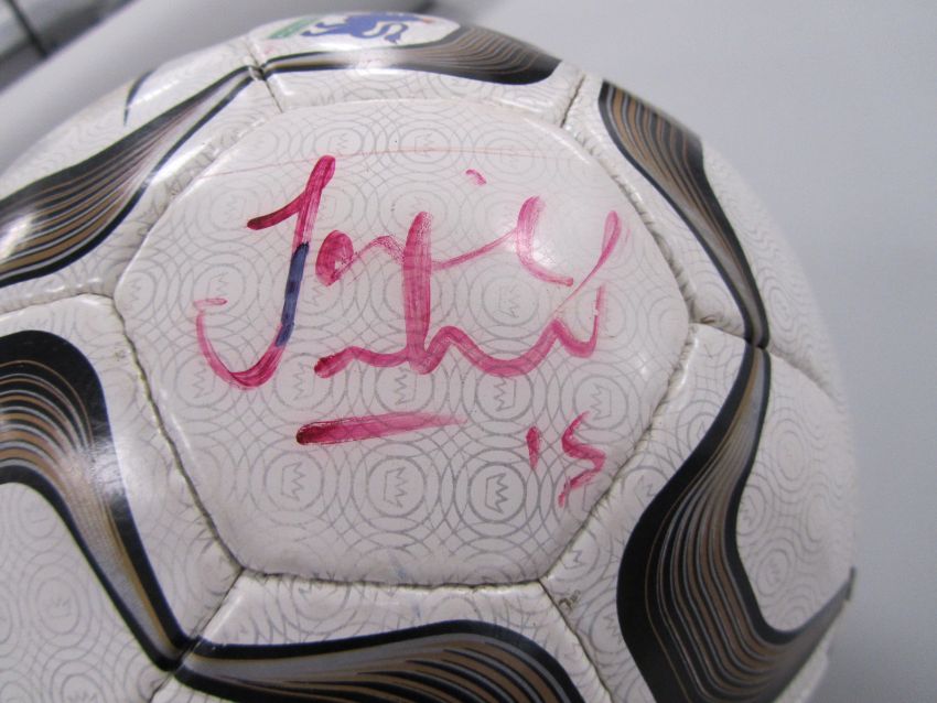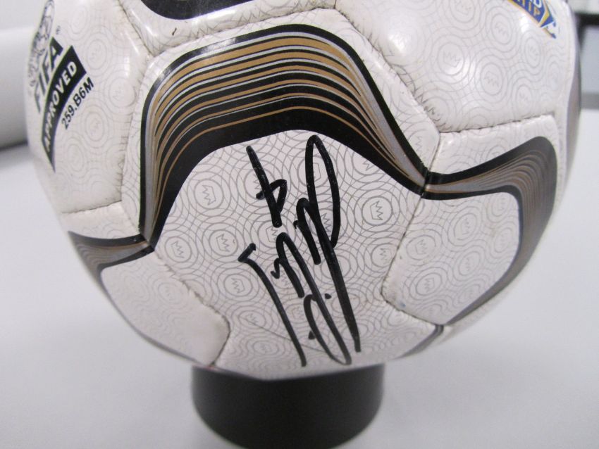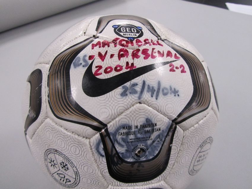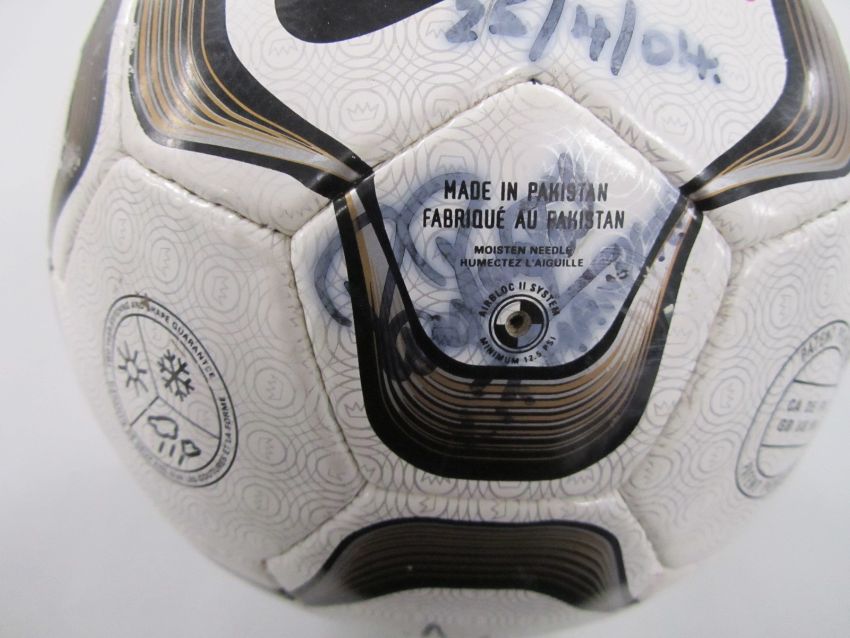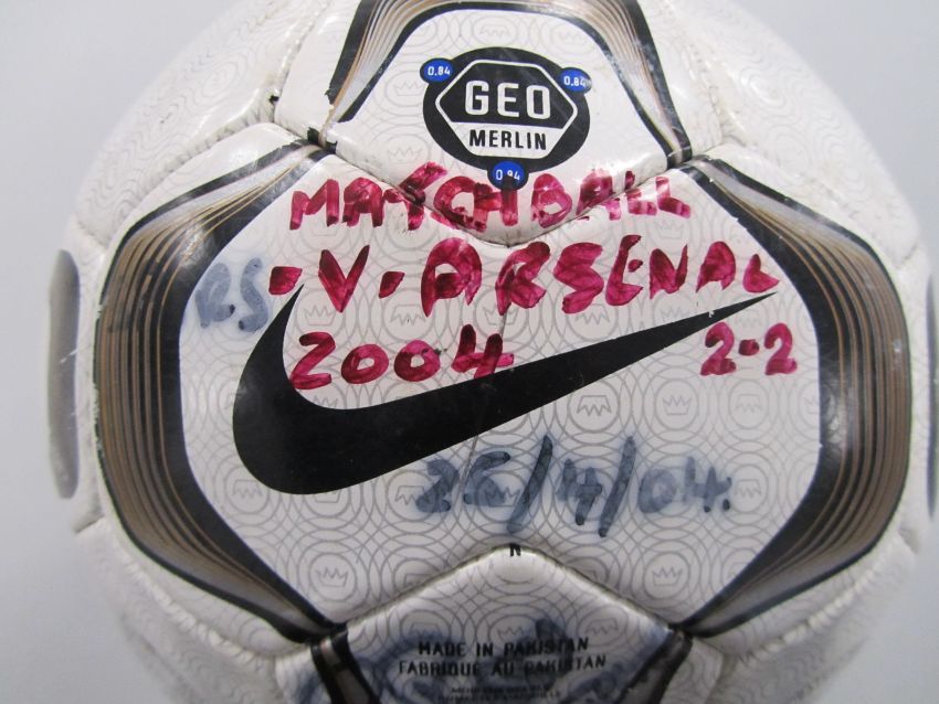 Matchball from Arsenal's Premier League clinching match v rivals Tottenham Hotspur at White Hart Lane, 25th April 2004, signed by the four goalscorers,bearing THE FA PREMIER LEAGUE and BARCLAYCARD PREMIERSHIP badges, signed in marker pen by goal scorers Robert Pires, Patrick Vieira, Jamire Redknapp and Robbie Keane, and additionally signed by the Spurs kitman Roy ReylandWith shades of 1970-71 Arsenal secure the Premier League title at arch rivals Tottenham Hotspur. The game ended 2-2 which was enough for the Gunners as title chasers Chelsea had lost in an earlier kick-off.Provenance: Roy Reyland Tottenham Hotspur kitman