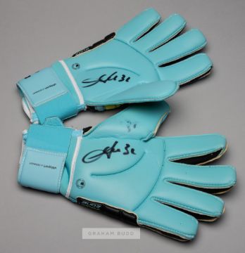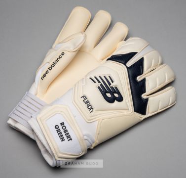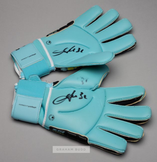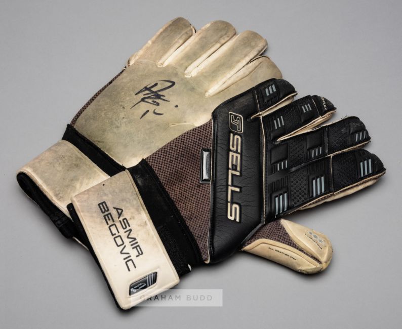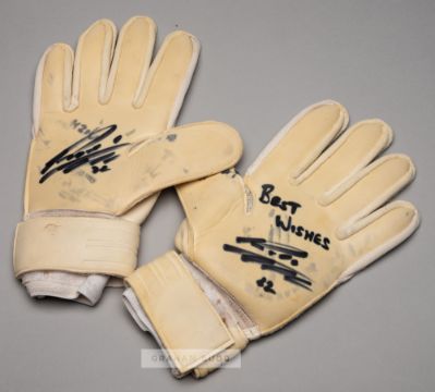 A group of four pairs of Chelsea goalkeepers' gloves,comprising: Ross Turnbull signed Puma gloves, white and silvered, printed ROSS TURNBULL, signed on each glove palm in black marker pen, each bearing wear and tear; Robert Green signed New Balance Furon gloves, cream, white and black, printed ROBERT GREEN, unused in good condition; Marco Amelia signed Uhlsport gloves, black, blue and yellow, printed MARCO AMELIA, each palm signed in black marker pen, little wear to each; Asmir Begovie signed Sells gloves, black and white, printed ASMIR BEGOVIC, each palm signed in black marker pen, each bearing wear and tear, (4 pair of gloves)