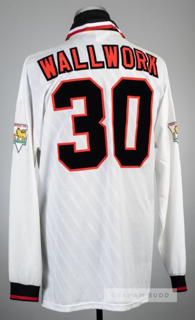 Ronnie Wallwork signed white Manchester United no.30 away jersey, season 1996-97,Umbro, long-sleeved with THE FA PREMIER LEAGUE CHAMPIONS 1995-1996 sleeve badges, club crest and sponsor logo, reverse lettered WALLWORK, signed to front in black marker pen, size XL, with handwritten letter from Ronnie Wallwork, bears yellow marks to reverse near neck