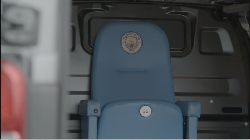 Manchester City blue executive heated no.33 seat from the Etihad Stadium,bearing round club crest, with flip-down seat, raised upon black supports on a astroturf square plinth, bearing no.33 seat number on underside of seat, 116 by 62 by 58cm., seat heating system not tested, some wear with marks