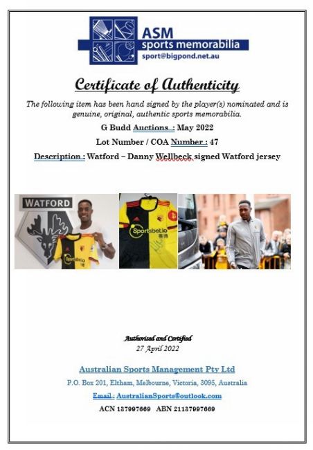 Danny Welbeck signed yellow and black Watford replica jersey 2019-20,Adidas, short-sleeved with club crest and sponsor logo, signed in marker pen on front, with retail tag and COA and photo proof