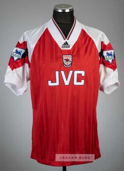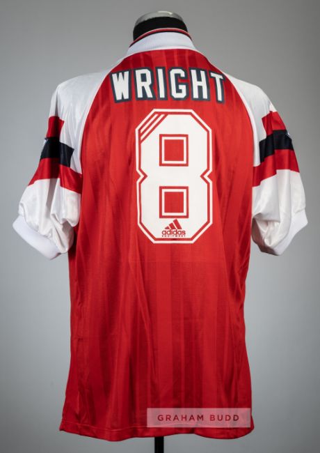 Ian Wright red Arsenal no.8 home jersey, season 1993-94,Adidas, short-sleeved with THE FA PREMIER LEAGUE sleeve badges, club crest and sponsor logo, reverse lettered WRIGHT, size 42-44in., corners of sleeve badges not stuck down onto sleeve