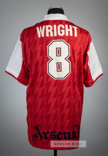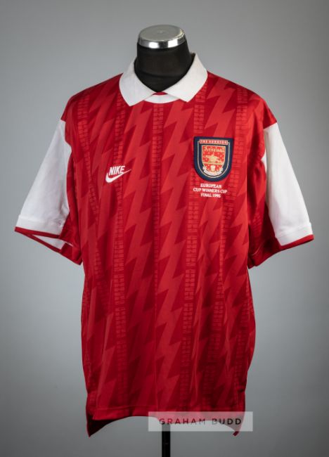 Ian Wright red Arsenal UEFA European Cup Winners' Cup Final No.8 jersey v Zaragoza, played at Parc des Princes Paris, 10th May 1995,Nike, short-sleeved with THE GUNNERS club crest badge, embroidered EUROPEAN CUP WINNERS CUP FINAL 1995, reverse lettered WRIGHT and ARSENAL, size XL, bears signs of dirt and discolouration on white collar and white number 8 on reverseZaragoza defeated Arsenal 2-1.