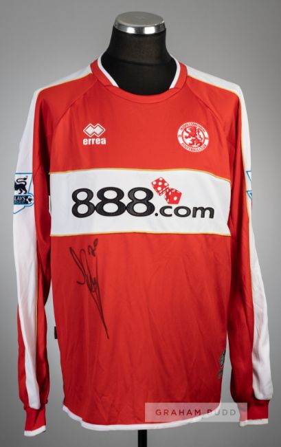 Yakubu signed red Middlesbrough no.20 home jersey, season 2006-07,Errea, long-sleeved with BARCLAYS PREMIERSHIP sleeve badges, club crest and sponsor logo, reverse lettered YAKUBU, signed in black marker pen on front and reverse, size XXL