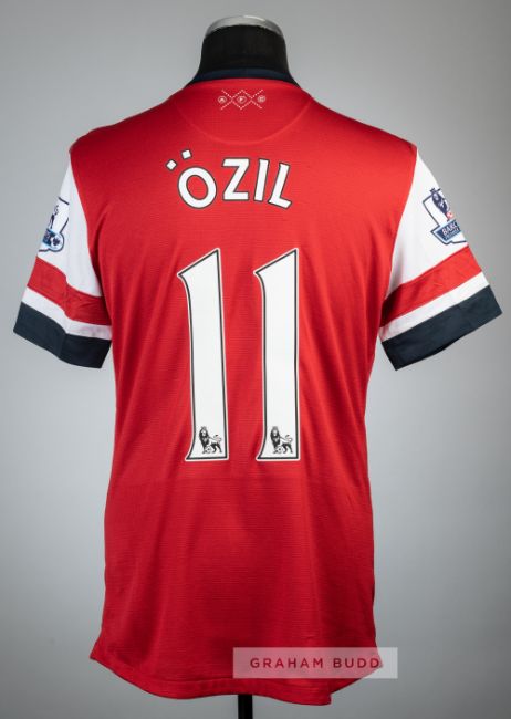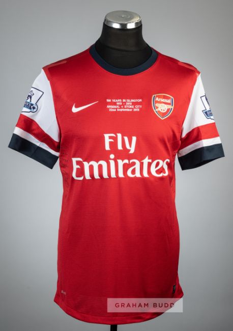 Nike, short-sleeved with BARCLAYS PREMIER LEAGUE sleeve badges, club crest, embroidered 100 YEARS IN ISLINGTON 1913-2013, ARSENAL V STOKE CITY 22ND SEPTEMBER 2013, sponsor logo, reverse lettered OZIL, size L, bears slight thread pulls/holes on reverse, rubber shoulder seams slightly tacky