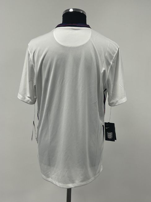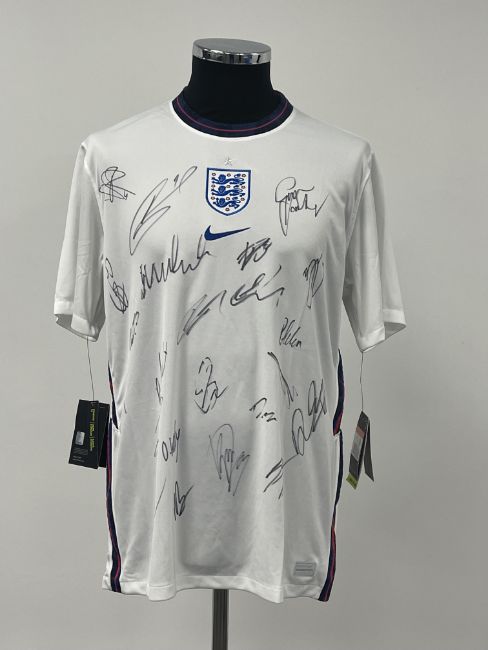 Nike, short-sleeved with England three lion emblem, signed in black marker pen on front by approximately 23 squad members, size L, with retail tag